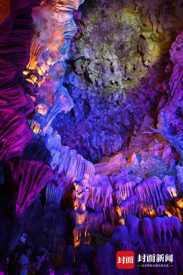 大象洞、盘龙洞、观音洞——峡谷里上百个溶洞成群分布,像一本本记录地质变迁的“日记”。这些溶洞不是一天长出来的,它们得先在黑黢黢的地下“熬”。地下水一点点浸入石头缝,溶进硬邦邦的石灰岩,“嘀嗒、嘀嗒”,水滴在石头上,没人听见;然后,水滴带着碳酸钙,在黑暗里慢慢堆,一百年才长几厘米,没人看见;熬啊熬!熬了几十万年,才长出现在的样子。后来,人们给溶洞装上灯,这些黑夜里长出来的石头才绽放出梦幻的光芒,特别好看。