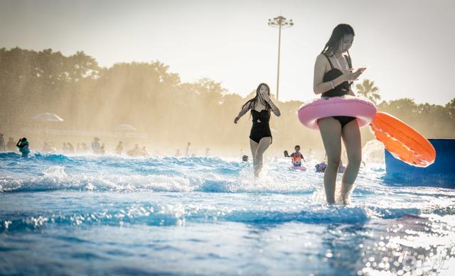 申城持续高温,不少游客选择前往上海玛雅海滩水公园戏水游玩,旅游、消暑两不误。