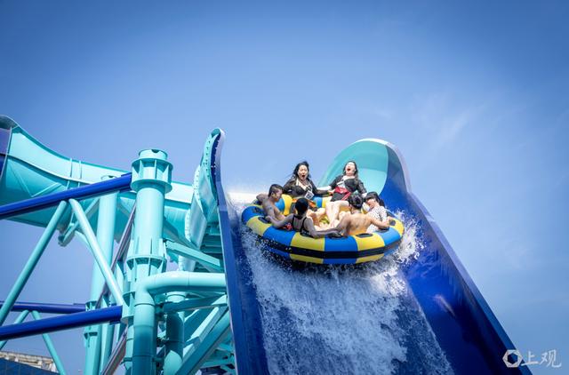 亲水娱乐是炎炎夏日不少市民、游客假日避暑的第一选择。 在上海耀雪水世界, 游客在水上项目玩得不亦乐乎。