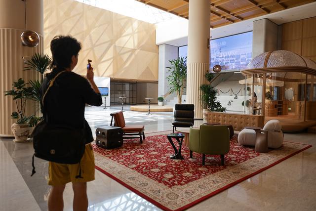媒体记者在拍摄湾里·诺岚酒店一层。新京报记者 王子诚 摄