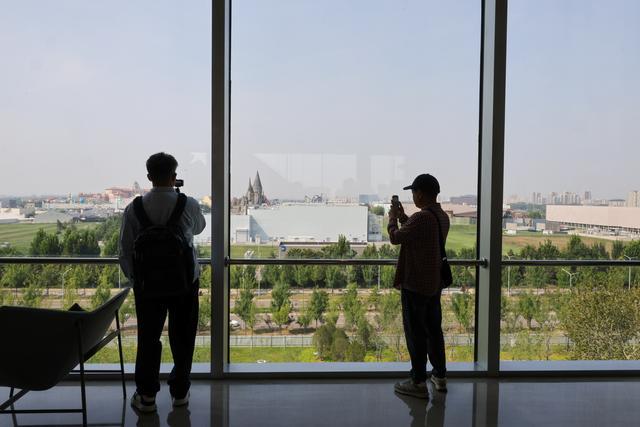 媒体记者在湾里·诺岚酒店拍摄北京环球度假区。新京报记者 王子诚 摄