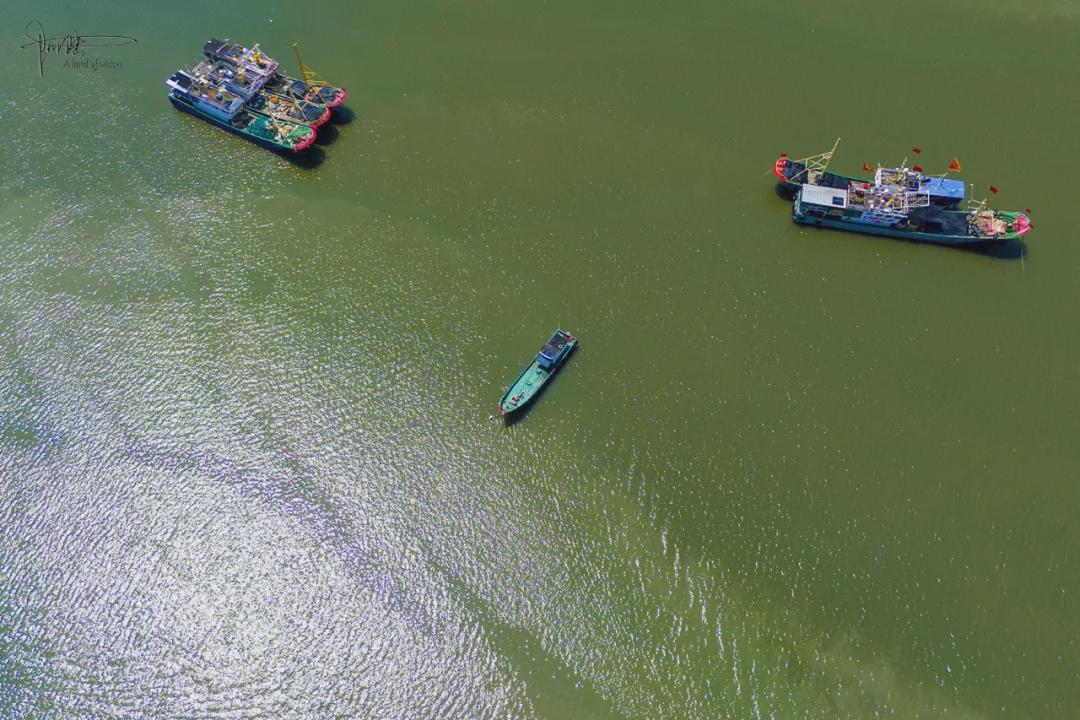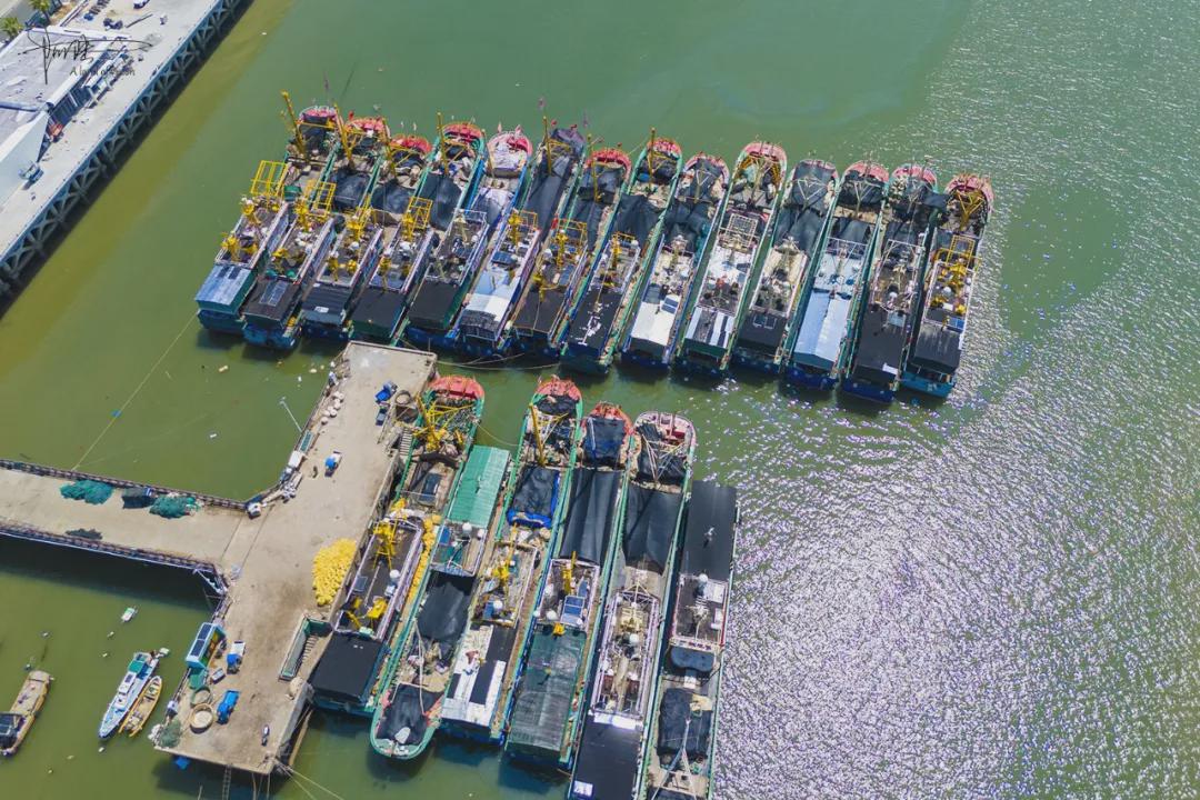 除了一簇簇大船稳稳地“扎根”在这片港湾的中央,每隔几米或者几十米,都会有独自抛锚的小型渔船在那里随波摇曳。不知道为什么,几艘小艇在这些大小不一的“船堆”之间来回穿梭,显得格外忙碌,而这个时间应该不是为了捕鱼吧?