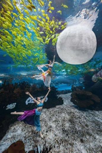 同时,上海海昌海洋公园还将推出多场新文化主题演出,实现传统与海洋的创意融合。10月1日至3日,2025年中国美人鱼公开赛暨国际精英赛冠军以三星堆出土文物为灵感,领衔演绎“青铜人面水舞秀”,化身象征祥瑞的神鸟,在碧波间舞动,仿佛唤醒沉睡千年的古蜀图腾。10月4日至6日,于海底世界馆内精心打造出巨型“圆月”景观,美人鱼化身“嫦娥仙子”,海底长袖舞动,轻盈“奔月”,与鱼群穿梭互动,将神话与水下美学完美融合,为游客呈现如梦似幻的沉浸式体验。