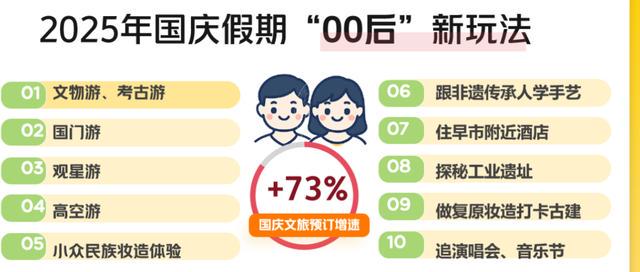 东方网记者程琦9月22日报道:随着“十一”黄金周旅游季的临近,一个可拼凑长达16天的“超级假期”正激发着前所未有的出游热情。美团最新数据显示,今年国庆文旅预订量同比猛增73%,其中00后游客占比高达62%,他们正引领着一场深刻的旅游变革。不再满足于传统观光,“文旅融合”成为关键词,文物游、边境游、非遗体验等深度文化玩法迅速崛起。