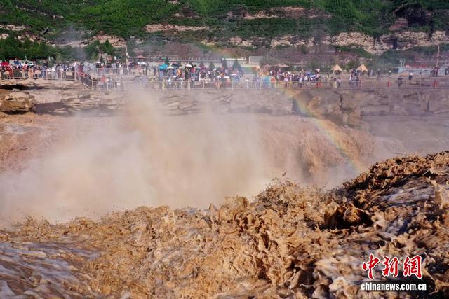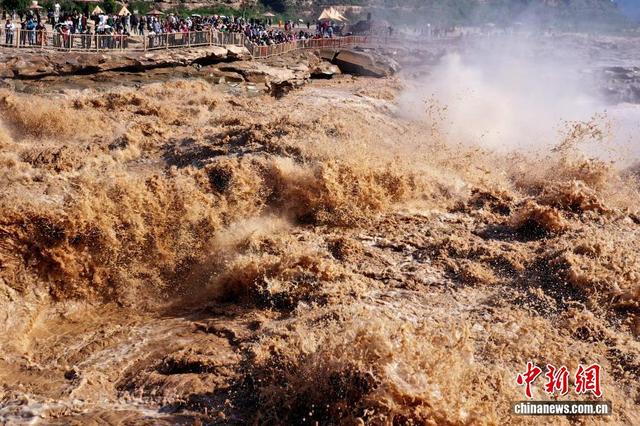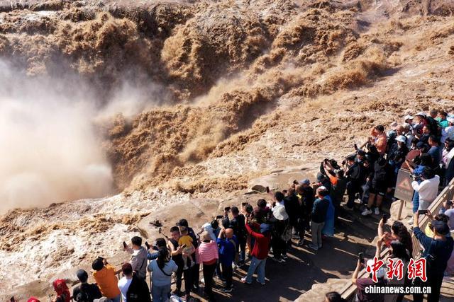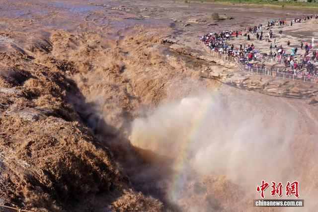 吕桂明 摄 9月23日,游客在山西吉县黄河壶口瀑布景区游览观瀑。金秋时节,受上游降雨和水库调节放水影响,位于山西吉县和陕西宜川县交界的黄河壶口瀑布水量大增,壮美奔腾景象吸引众多游客前来游览。(无人机照片)