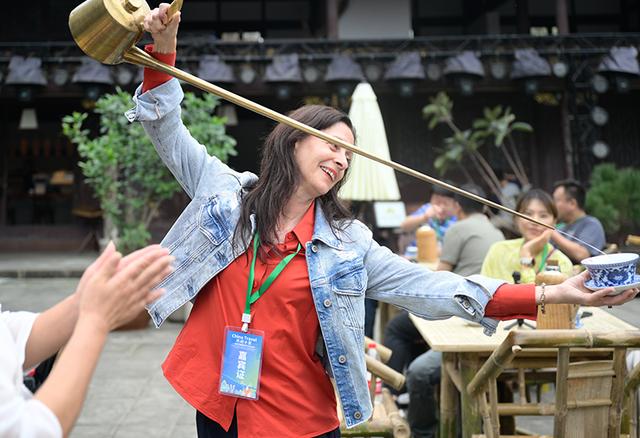 除了川剧盛宴,茶艺体验也让国际主播网红们沉醉其中。氤氲茶香中,国际主播网红手捧青花盖碗,品味着巴蜀茶文化的醇厚。茶艺师行云流水的冲泡动作极具观赏性,引得大家纷纷举起手机定格美好画面。