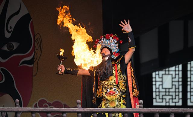 更令人屏息的是川剧吐火绝技——演员一个转身,口中喷出火焰,惊险刺激,赢得台下阵阵热烈掌声。