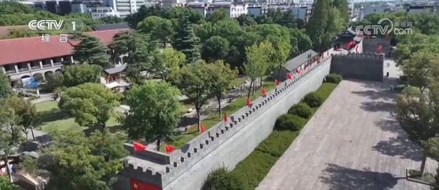 在浙江嘉兴,大街小巷喜气洋洋。在子城遗址公园,一面悬挂在城墙上的超大国旗,吸引过往市民纷纷驻足合影留念。有些景区还增设了一些国庆文创装置,吸引市民游客前来拍照打卡。