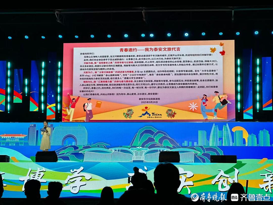 仪式上,哔哩哔哩知名UP主颢鑫现场分享“宝藏泰安”探索心得,并联合发布线上互动话题。随后,泰安市文化和旅游局向全体驻泰大学生发出《青春邀约——我为泰安文旅代言》,泰安市2025年“十大金牌未来之星”一等奖获得者、泰山学院旅游学院学生吕如平作为代表,号召大学生以“探寻者、讲述者、参与者”的身份,共同传播泰安文旅形象。