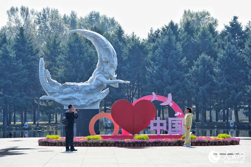 游客在净月潭景区新设置的景观前拍照留影。人民网记者 李洋摄