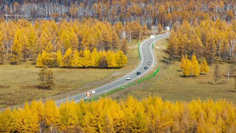 9月29日,游客在内蒙古阿尔山国家森林公园驾车游玩(无人机照片)。金秋时节,内蒙古阿尔山国家森林公园色彩斑斓,景色如画。 新华社记者 贝赫 摄
