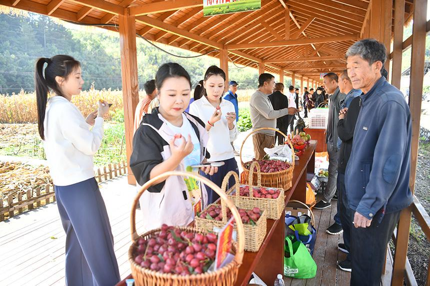 神龙山下,山谷集市早已挤得水泄不通。金灿灿的小米堆成小山,红艳艳的山楂与苹果箩筐挨着箩筐,空气里漾开酸甜的香气。人潮在过道上涌动,吆喝声、笑声、讨价声此起彼伏……40余种农产品,为游客们带来了一场视觉与味觉的双重享受。