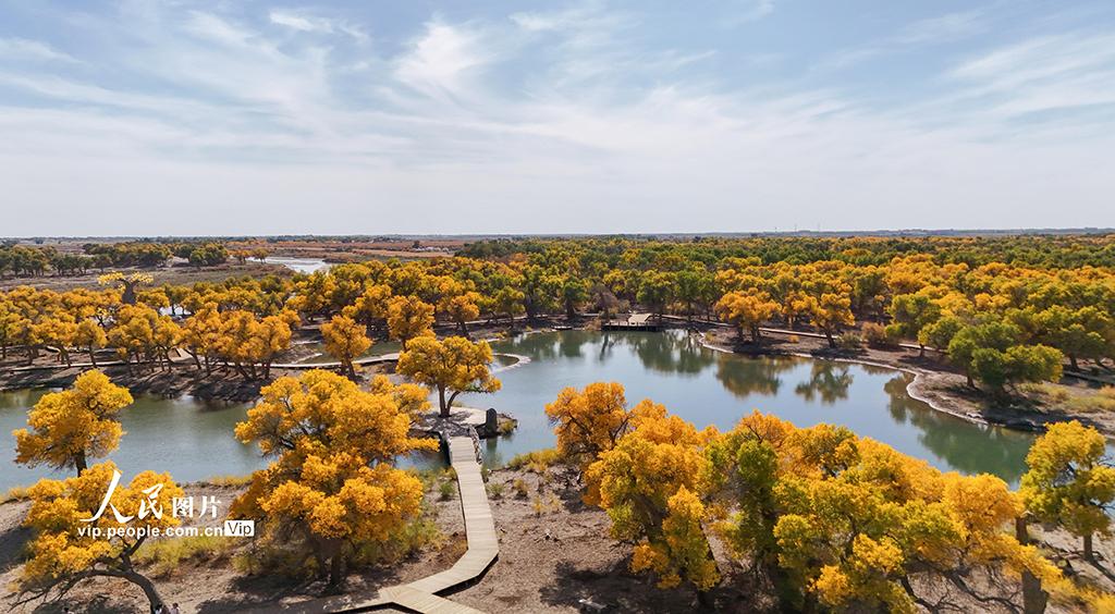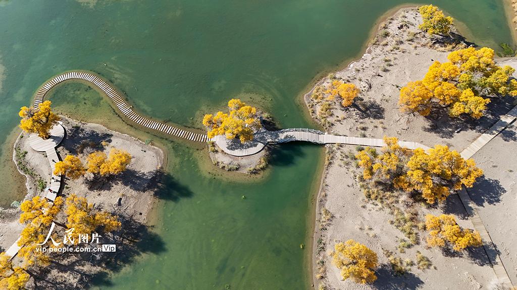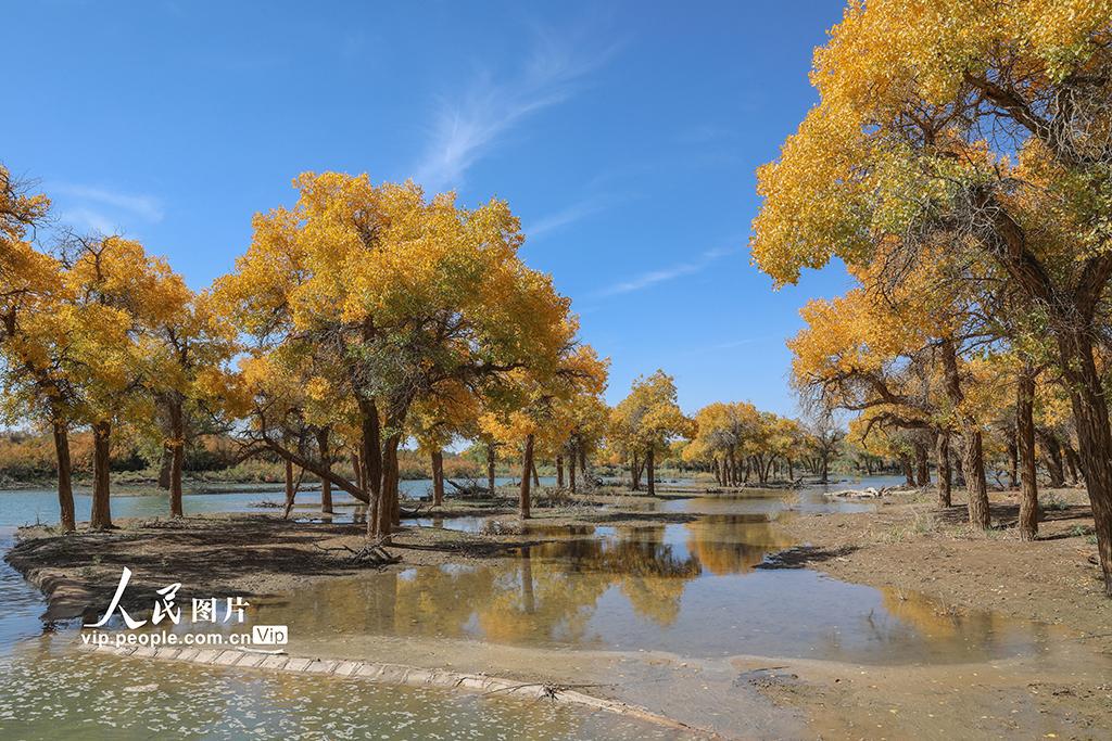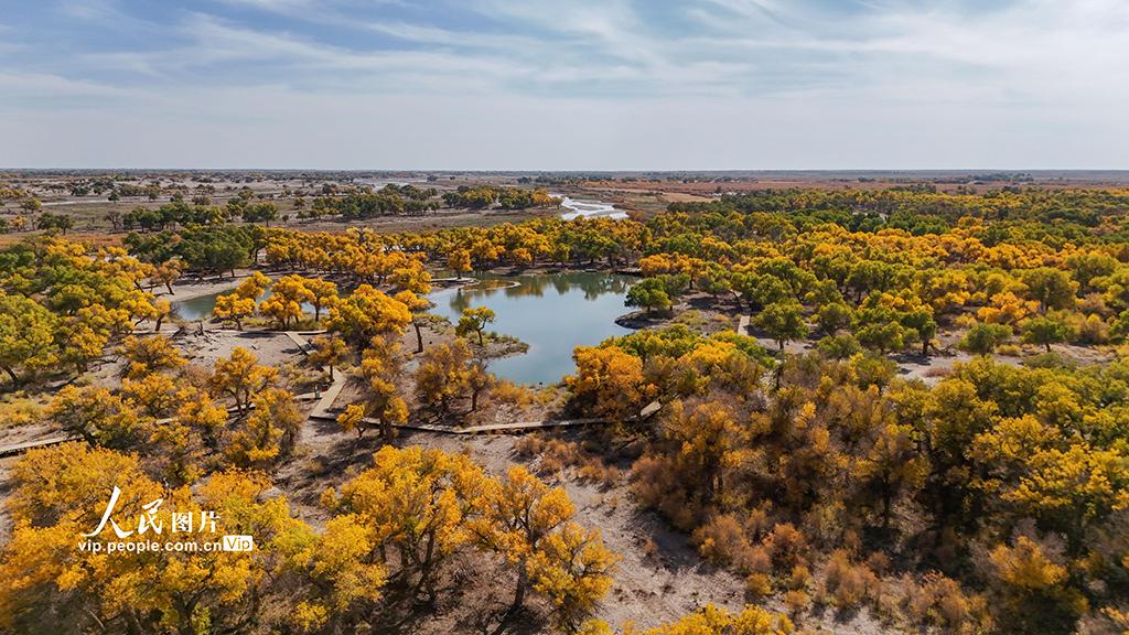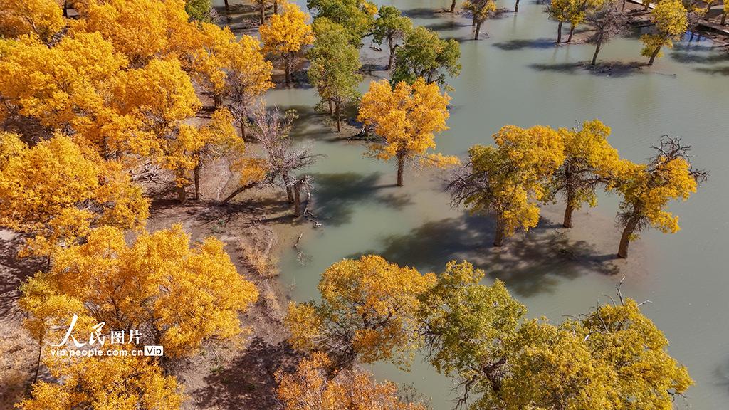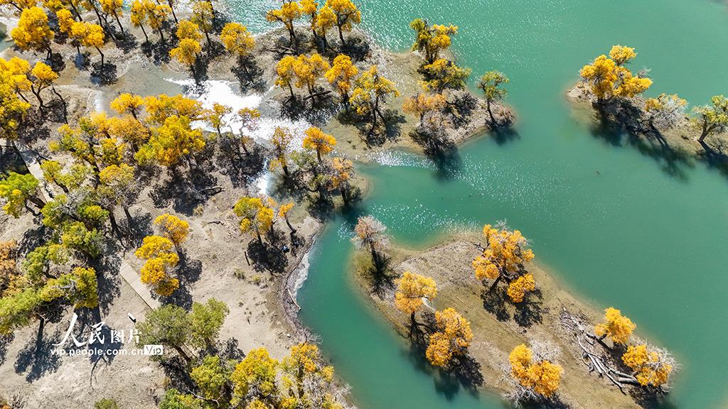 2025年9月30日,位于内蒙古阿拉善盟额济纳旗的大漠胡杨林景区,金黄色的胡杨林与碧绿的湖水相映成景,美不胜收。谭昌藩摄(人民图片网)