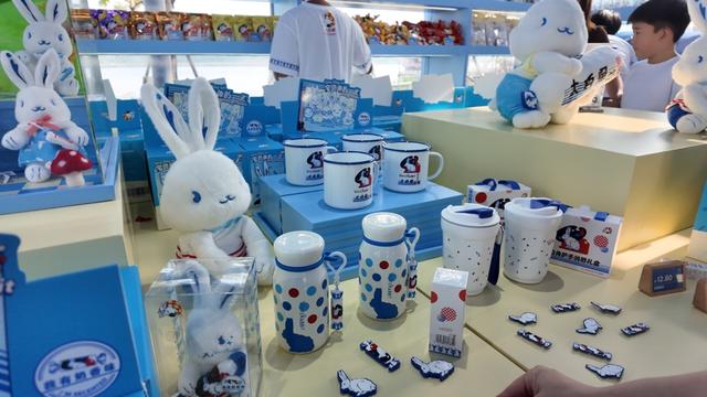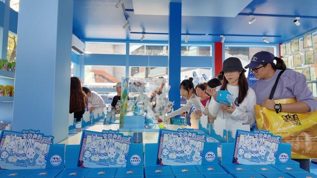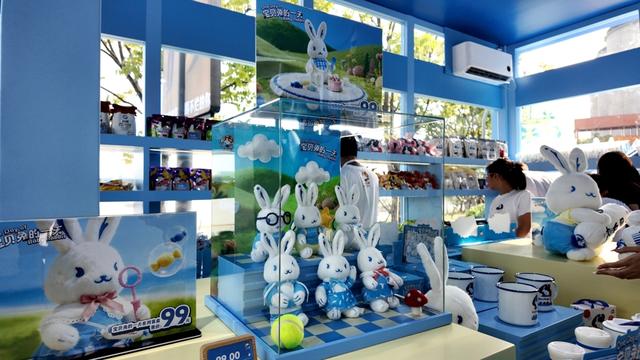 同期亮相徐汇滨江的大白兔快闪店内,最受欢迎的产品莫过于大白兔毛绒挂件盲盒。这组线下首发的盲盒产品不仅呈现了焕新后的大白兔IP形象,还有真切可闻的奶香味,通过触觉、视觉和嗅觉丰富消费者的感官体验。现场售卖的玩偶、抱枕、冰箱贴、徽章和环保袋等周边产品都颇受游客青睐。