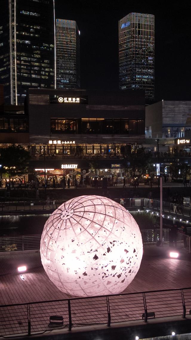 当“Citywalk”城市漫步升级为“Moonwalk”月下漫步,城市艺术装置也引入潮流欢快的元素,由此诞生了上海新锐建筑师工作室“是所SHISUO”与徐汇区非遗剪纸传承人石勤玲共创的大型滨水艺术装置《月满》。