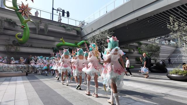 位于漕河泾开发区的鑫耀光环·Live,是徐汇乃至上海新晋的“网红”二次元商场。10月1日当天,商场内举办的“荣耀觉醒电竞节”上玩家们激战正酣,场外来自全国各地的Coser不仅现场组队巡游,还在“茗动次元”市集中担任一日店长,化身米哈游、鹰角等本土游戏大厂开发的知名IP中的角色,与往来的市民游客和专程前来的二次元爱好者共庆佳节。