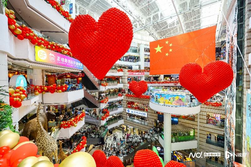 国庆佳节,正佳广场内节日氛围十分浓厚。场内以“中国红”为主视觉元素,将整个空间打造为沉浸式节日体验场:中庭上空悬挂着巨幅国旗,并有超过200面国旗在全场不同区域整齐悬挂,鲜艳的红心气球点缀其间,共同构筑一片红色海洋,形成强烈的视觉冲击;多处设置国庆主题打卡墙则成为市民拍照留念的热门打卡点。