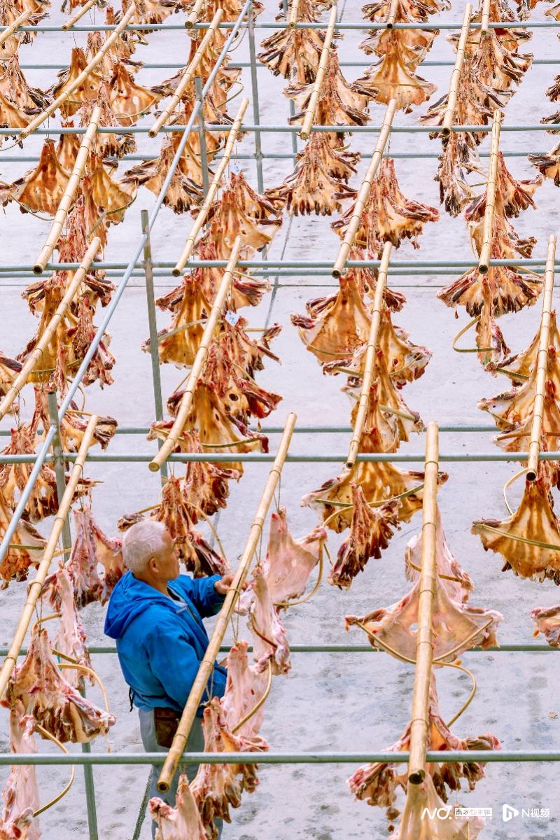 在江门的村落里,屋顶、阳台、鱼塘边挂满一排排金黄的鱼干,空气中飘散着淡淡的咸香,仿佛在诉说着秋日的丰收故事。鲮鱼干是这里的招牌,将鲮鱼晒至五成干后,涂上特制腌料再晒干,当地人唤作“封鲮鱼”,市场店铺里捆捆封鲮鱼整齐排列,顾客们挑选得热闹非凡。睦洲河鲜“三宝”——黄鱼、河虾、黄沙蚬,更添秋日风味。远眺台山川山群岛,晒场色彩浓艳,海船拉回的红虾、海鱼铺满竹帘,海风裹着阳光发酵着每一份鲜味,温度高一摄氏度,鲜香就浓一分。