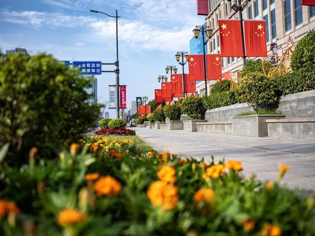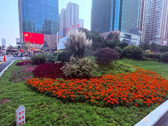 中原中路花簇开遍街角,与国旗相映成景,城市国庆热意正浓。