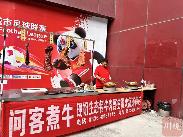 足球不止在场上,更在集市与街头。在赛场外围,“活力赛场·藏韵市集”人头攒动,来自甘孜和绵阳的特色产品集中亮相,每个摊位前都围满了询价购买的游客。牦牛肉干、野生菌菇与青稞饼散发着诱人香气,绵阳即食米粉、江油肥肠罐头等产品让现场观众轻松带走美味……