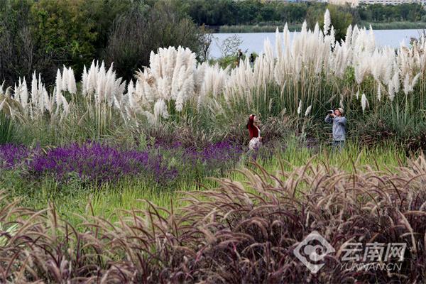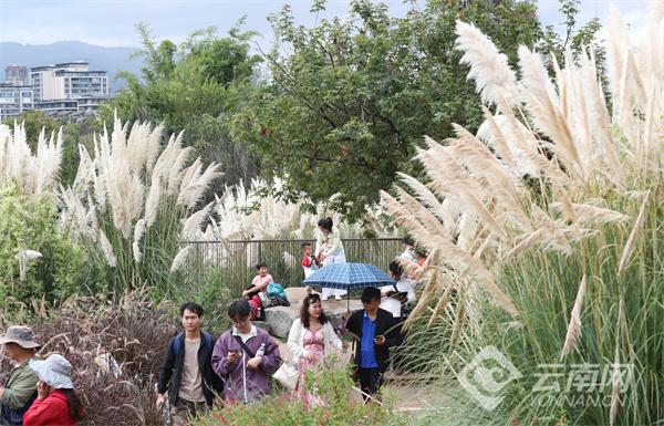 金秋时节的滇池绿道坝河湿地公园,迎来秋日里最富诗意的时刻,成片的芦苇、狗尾草和紫花苜蓿等湿地植物在滨水景观带绘就诗意秋景生态画卷,成为市民游人的打卡胜地。湿地公园举行的"秋野集"在国庆中秋假期摆开长街盛宴,市民游人品咖香尝美食;骑行绿道、漫步栈道,打卡诗意秋景,尽情享受生态休闲度假日的惬意时光。