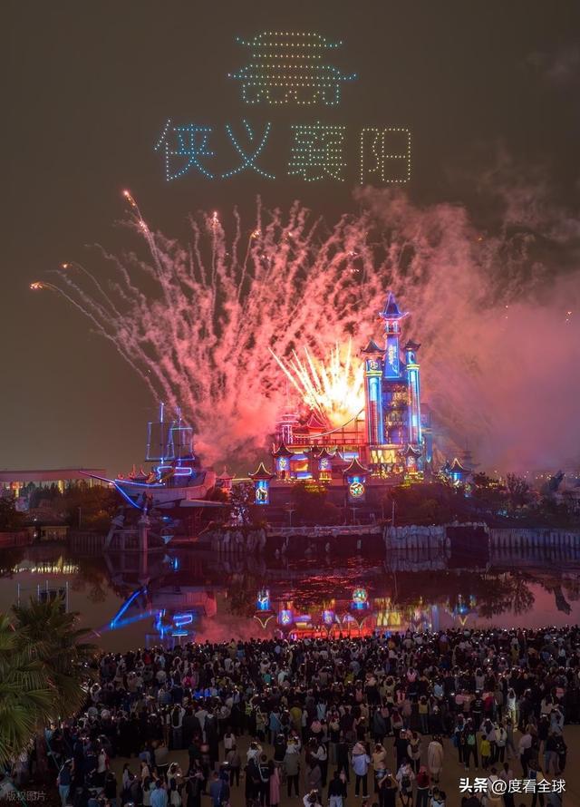 从古代的襄阳城郭、三国时期的金戈铁马,到现代襄阳的繁华都市、文旅产业的蓬勃发展,一幕幕画面在城堡外墙上流转,仿佛穿越时空的隧道,让游客沉浸式地感受这座城市的过去与现在。当光影秀进行到高潮时,城堡顶端突然绽放出璀璨的烟花,金色、银色、红色的烟花在夜空中炸开,形成 “欢度国庆”“中秋快乐” 等字样,引得现场游客纷纷拿出手机拍照留念。更令人惊叹的是,千架无人机同时升空,在夜空中组成了 “万里长城”“嫦娥奔月” 等经典图案,与烟花、光影秀完美联动。据工作人员介绍,此次无人机秀的规模创下了华中地区主题乐园的新高,每一架无人机的飞行轨迹都经过精准计算,确保图案的清晰与完整,当千架无人机组成的 “中国龙” 在夜空中盘旋时,现场响起了经久不息的掌声与欢呼声。