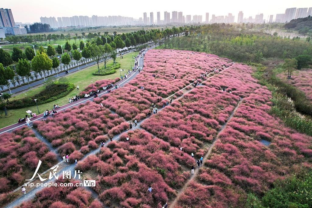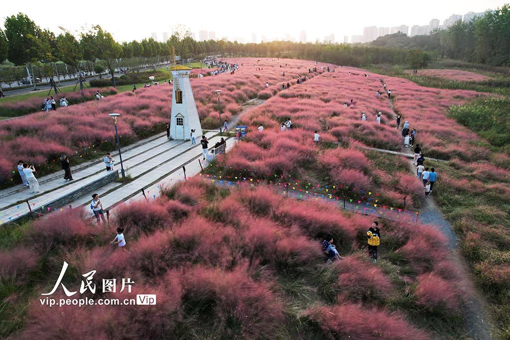 国庆假期,安徽省六安市金安区赓续公园内大片粉黛乱子草竞相绽放,粉色“花海”吸引众多游客前来观赏。郑金强摄(人民图片网)