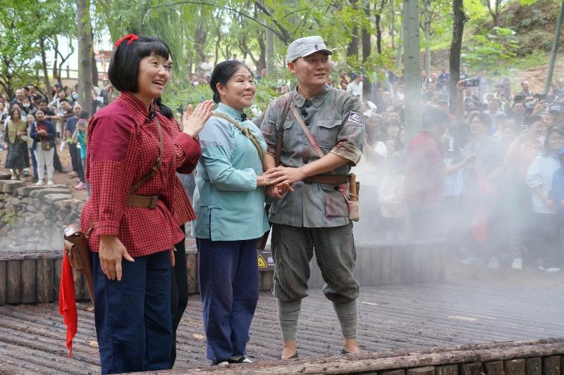 国庆中秋假期,位于沂蒙革命老区的山东省临沂市沂南县常山庄村的山东红嫂家乡旅游区,焕新升级打造的沉浸式互动演绎《重走支前路》、舞台剧《火线桥》等演艺项目,用情景演出方式讲述红色故事,让游客从参观者变成体验者,每天都吸引大量游客前来体验打卡。(图/文 尹君 )