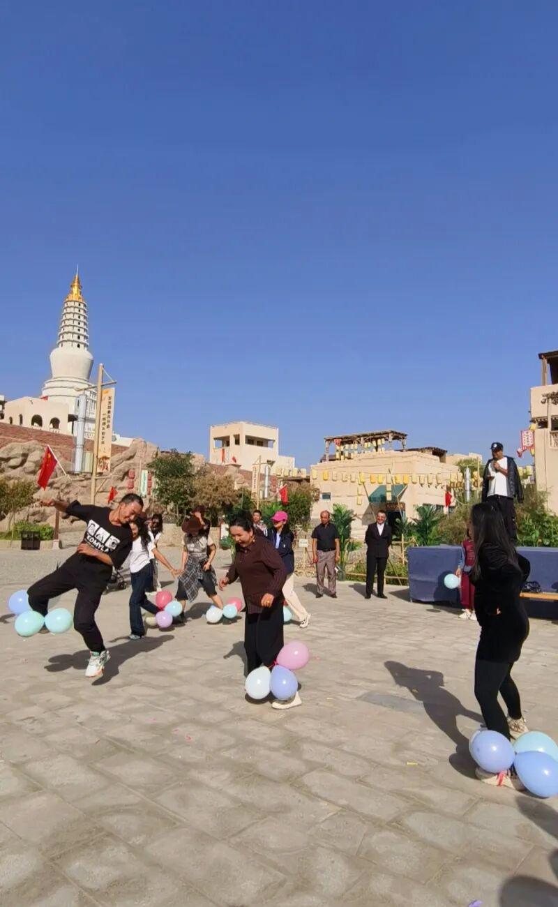 10月2日,在和田县约特干故城景区,欢乐踩气球比赛上演。和田地区融媒体中心 胡礼政摄