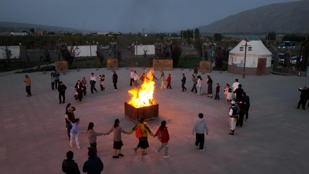 10月3日晚,“情聚阿合奇・篝火贺团圆” 国庆中秋篝火晚会在阿合奇县玛纳斯史诗馆广场举行,大家欢聚一堂,用欢歌笑语礼赞祖国华诞、共话中秋团圆。来源:阿合奇零距离微信公众号