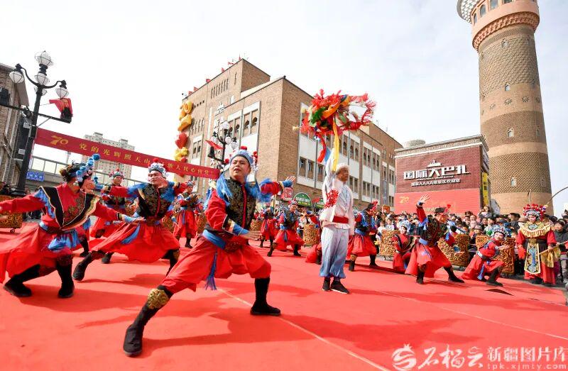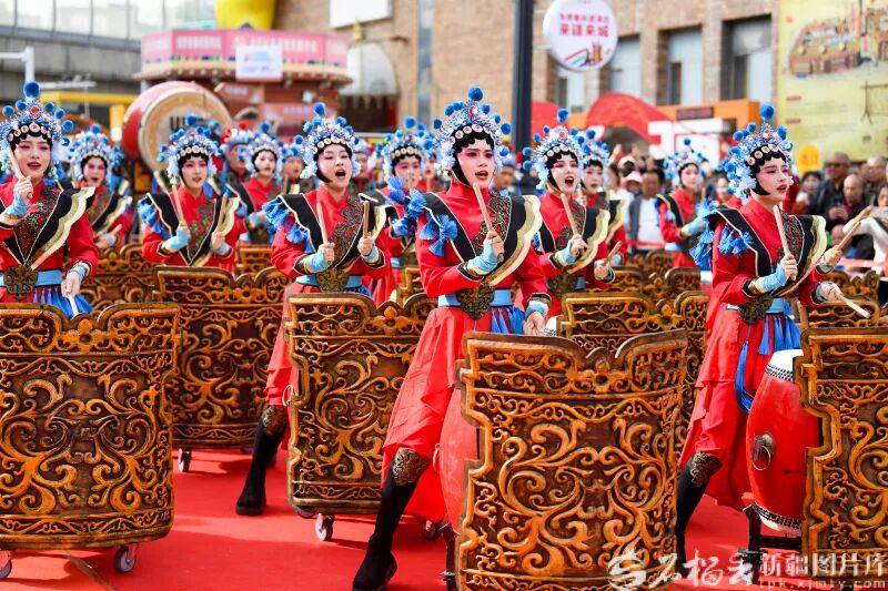 10月1日,乌鲁木齐大巴扎步行街洋溢着浓浓的节日氛围。随着领鼓人一声令下,来自陕西神木的非物质文化遗产代表性项目——“忠勇杨家鼓”震撼开场,为各族群众献上了一场气势恢宏的文化盛宴。石榴云/新疆日报记者 汤永摄