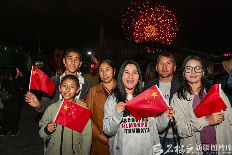 10月1日晚,群众在乌鲁木齐市水上乐园与燃放的焰火合影留念。石榴云/新疆日报记者 约提克尔·尼加提摄