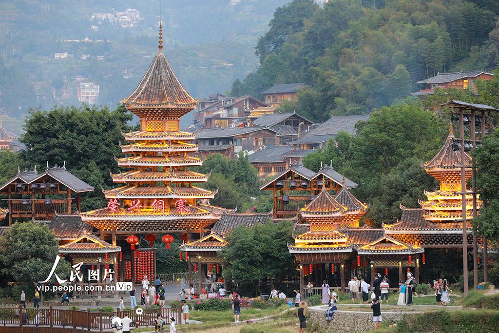 2025年10月5日,游客在贵州省黔东南苗族侗族自治州黎平县肇兴侗寨参观游玩。张恩鑫摄(人民图片网)