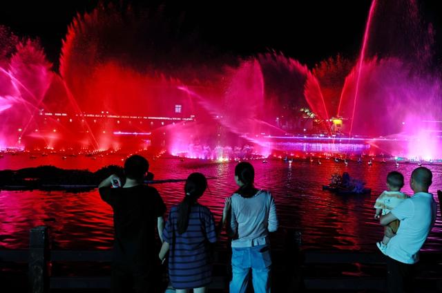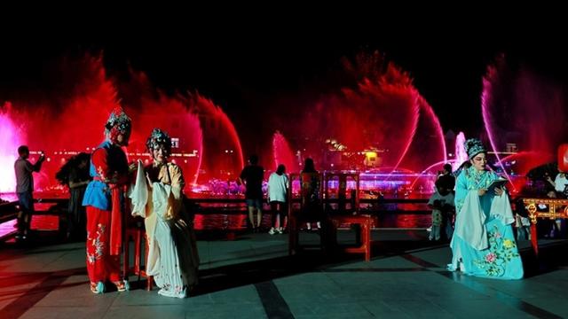 中秋之夜,在金山区金山嘴渔村祥鱼湖畔,汇集了许多市民游客,人们一边欣赏中秋明月,一边观赏音乐喷泉和戏曲表演。同时,渔村大街小巷国旗飘扬,人头攒动。整个渔村呈现其乐融融景象。