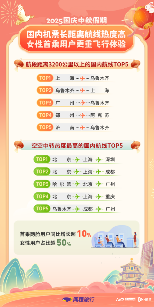 这个假期,游客不仅愿意花钱,更愿意为更好的体验花钱。据飞猪平台发布的《2025国庆中秋假期出游快报》显示,今年双节期间,游客出行的客单价同比去年提升了14.6%,95后游客预订人次占比最高,达到近四分之一。同程旅行数据进一步印证高品质趋势,国内首乘用户中预订头等舱和商务舱的用户同比增长超10%,其中女性占比过半。由此也反映出,首次乘坐飞机出行的用户随着消费水平的提升,也更加注重飞行的舒适度和体验感。