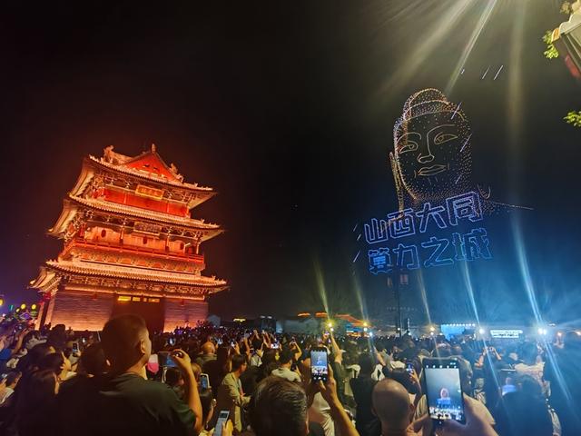在今年暑期部分日子和国庆中秋假期,大同请来国内一流的无人机表演团队,量身定做了符合大同历史文化和经济转型的无人机表演,每晚,八千架无人机的点点光芒不断变换,组合出云冈大佛、赵武灵王、花木兰、算力之城等十多个图案,在夜空中熠熠生辉。市民游客早已等待在周边街巷,观者之多可谓摩肩接踵,随着表演变化都发出阵阵赞美之声。