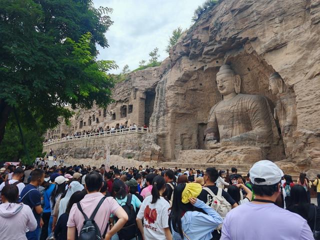 今年暑假期间云冈石窟游人如织。