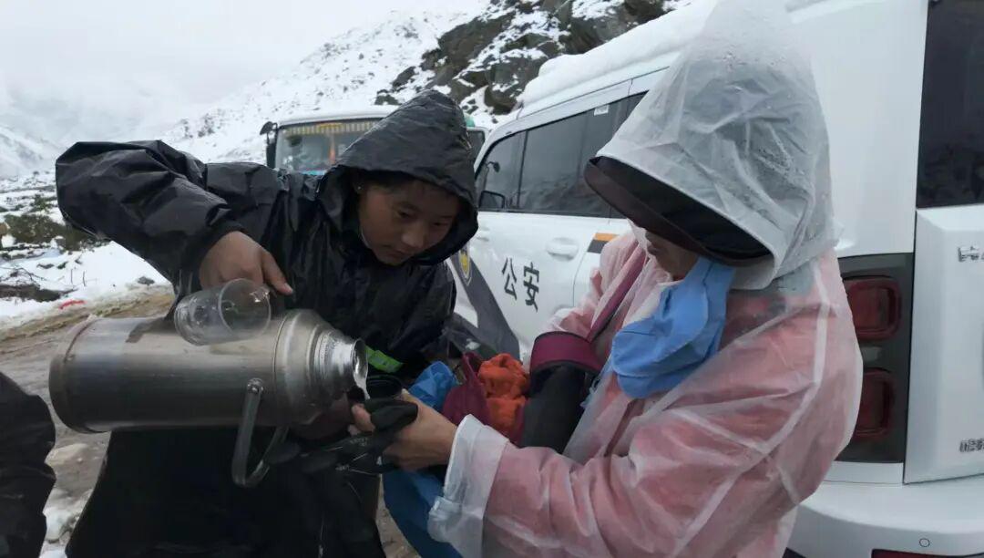 ▲10月5日下午,救援队员给下撤游客倒奶茶。图/陈格爽 摄