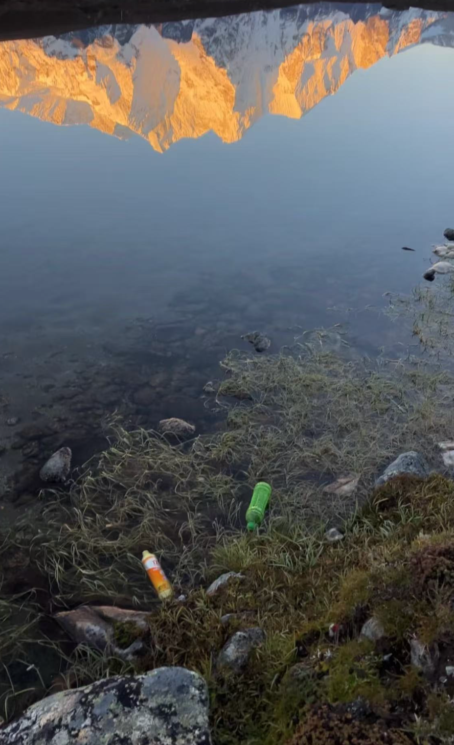 ▲今年“十一”前后,倒映着日照金山的湖边零星散落着塑料瓶。受访者供图