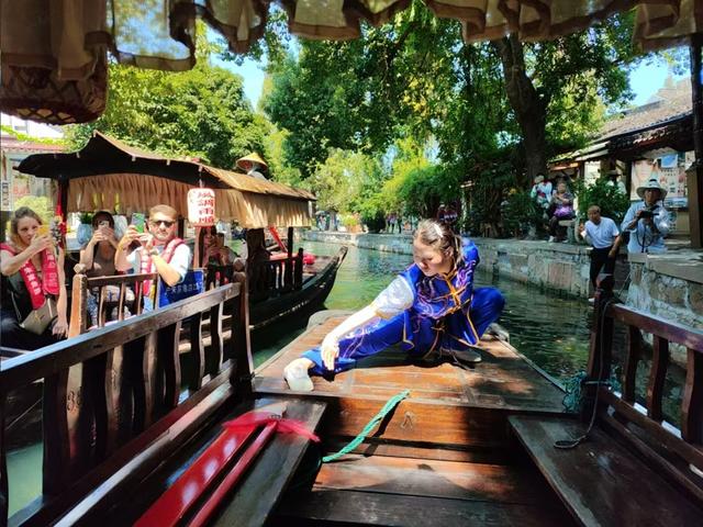 朱家角古镇景区,外国游客上岸后学习船拳招式。