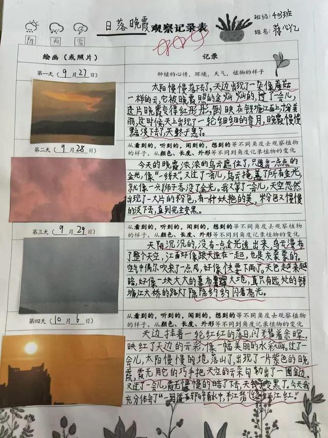 朴老师说:“平时生活中,孩子们很少会有连续观察的习惯。小长假期间的观察,让孩子们留下了很多真实、宝贵素材。回校后我们就会在习作课上对大家的记录进行点评,进一步修改,最后形成一篇完整的观察日记。”