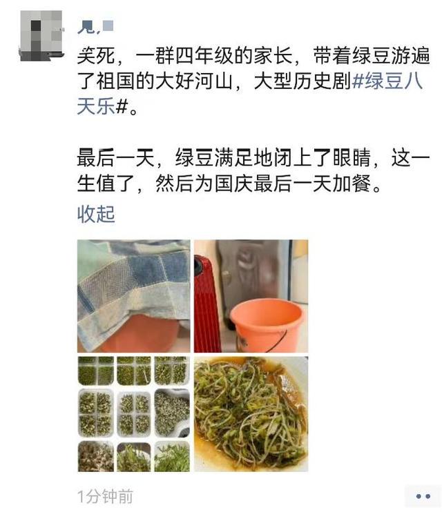 “笑死,一群四年级的家长,带着绿豆游遍了祖国的大好河山,大型历史剧#绿豆八天乐#。”陈女士的孩子在杭州一所小学四年级就读,秋假前,语文老师布置了这个作业,让孩子们在小长假里观察绿豆发芽的生长过程。
