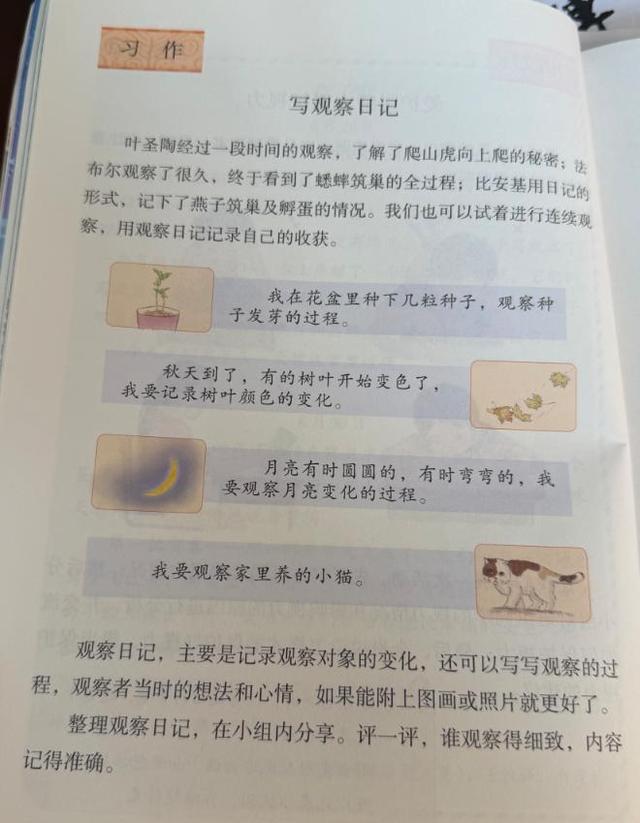朴老师说:“四年级语文上册的第三单元,有一篇课文是叶圣陶的《爬山虎的脚》,这就是一篇很好的观察作文范文,所以这个单元也有相应写观察日记的习作要求。这周,我们正好上到第三单元,所以大部分老师会在这个小长假布置观察作业,让孩子们利用小长假的时间进行连续的观察。”