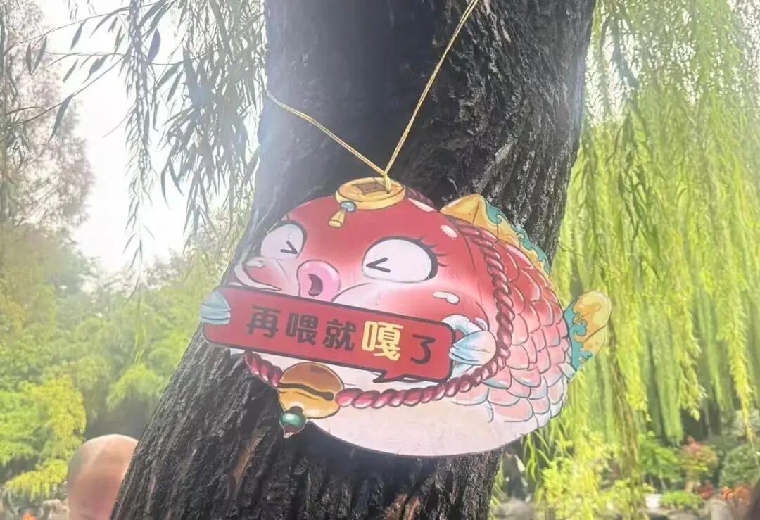 视频显示,泉水中锦鲤的身子鼓得像气球一样,摆动尾巴缓慢地游动着。周围树上还挂有卡通锦鲤告示牌“再喂就嘎了”。