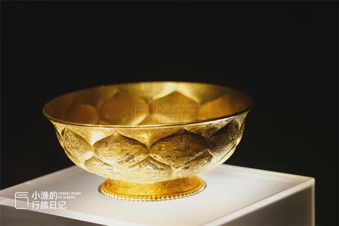 鸳鸯莲瓣纹金碗(陕历博镇馆之宝):纯金器。工艺卓绝,每一莲瓣均饰以不同图案,举世罕见。何家村一共出土了两件,一件放在何家村大唐遗宝馆,一件放在陕历博的第3展厅内。