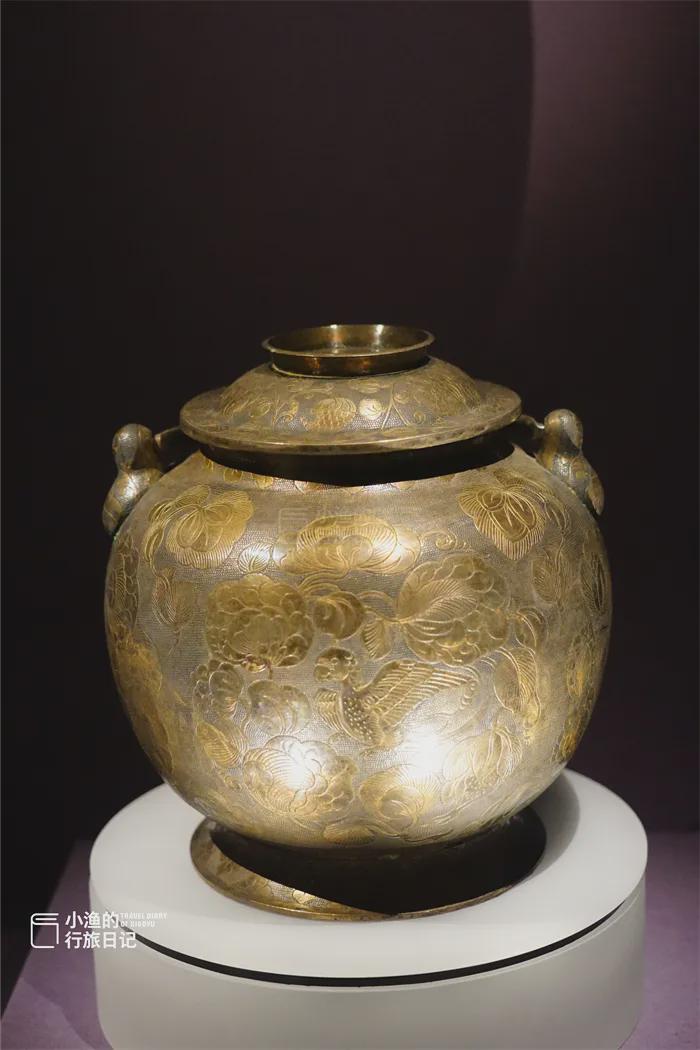 鎏金鹦鹉纹提梁银罐(陕历博镇馆之宝):银质鎏金。与此罐造型、纹饰几乎完全相同的器物,在全世界范围内仅此一件。