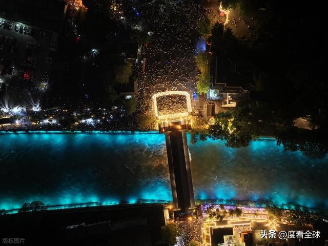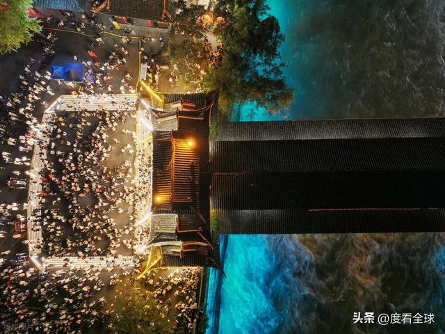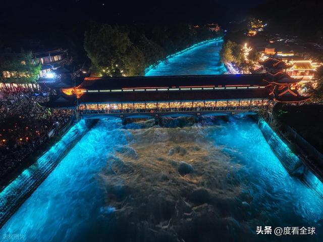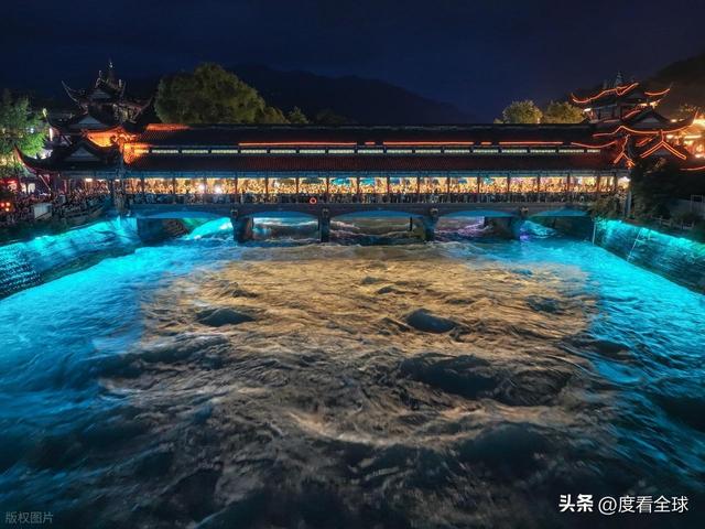 当暮色像墨汁般漫过玉垒山的轮廓,岷江突然睁开了蓝色的眼睛。那些藏在波心的幽蓝光点,时而聚成灵动的光带缠绕着南桥的雕梁画栋,时而散作细碎的光斑随浪涛翻滚,仿佛有人把银河揉碎了撒进了江里。举着相机的游客忍不住惊呼,手机屏幕里的江水早已化作流动的蓝钻,而脚下青石板上的倒影,正将这份梦幻拓印成触手可及的浪漫。这就是让全网喊出 “此生必刷” 的都江堰蓝眼泪 —— 一场穿越两千年的时空对话,在灯光与流水的交响中徐徐展开。