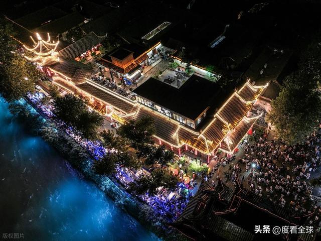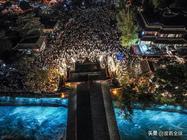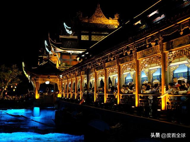 蓝眼泪的魅力远不止于视觉冲击,它早已串联起都江堰的夜游生态,让 “夜食、夜游、夜展、夜秀” 形成完整的体验链条。观赏完蓝光,与南桥一墙之隔的灌县古城正灯火通明,明清风格的建筑在灯笼光下愈显古朴,文记糕点等非遗店铺飘出阵阵香气,老字号里的匠人仍在专注地打磨手工艺品。偶尔能遇上蜀郡守开城门仪式,身着古装的演员迈着庄重的步伐穿过宣化门,古城巡游的队伍带着传统乐器的声响缓缓走过石板路,让人恍然有种穿越回旧时光的错觉。