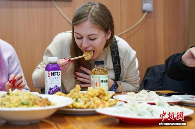 10月11日,黑龙江饶河,俄罗斯游客在中餐馆品尝饺子。中新社记者 赵宇航 摄