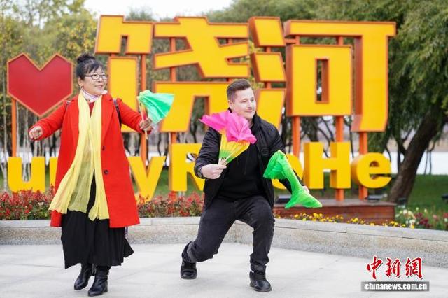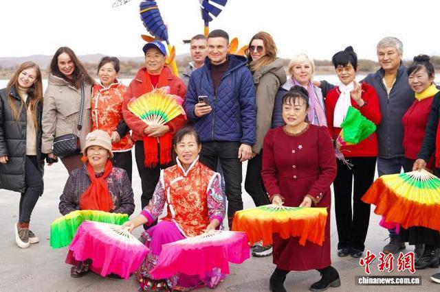 10月11日,黑龙江饶河,俄罗斯游客与东北人学习东北大秧歌。中新社记者 赵宇航 摄